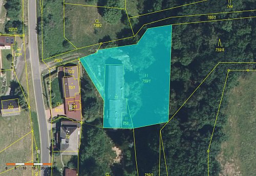 Součástí prodeje je také ideální spoluvlastnický podíl 1/2 na navazujících pozemcích o celkové výměře 27 115 m², podíl činí 13 557,5 m².